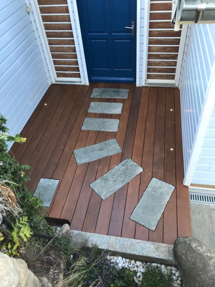 Conception et réalisation d’une terrasse bois exotique, avec une intégration de pierre. Pose sur le chantier à St Paul en 7 jours