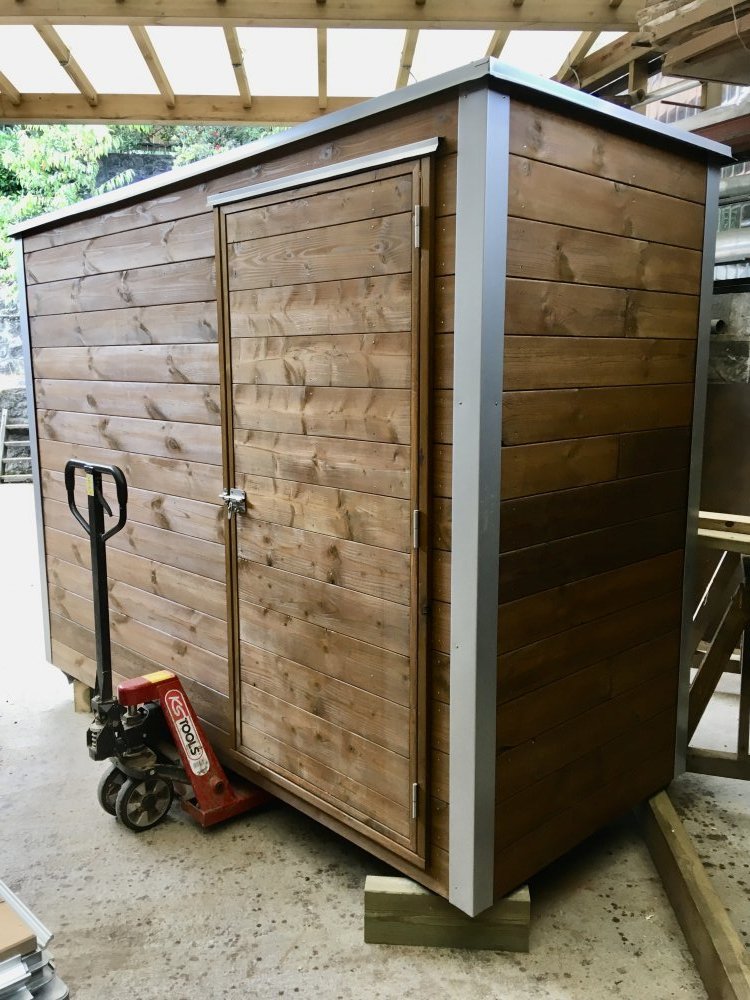 Conception et réalisation d’un abri de jardin bois. Pose sur le chantier à Saint Gilles les Bains.