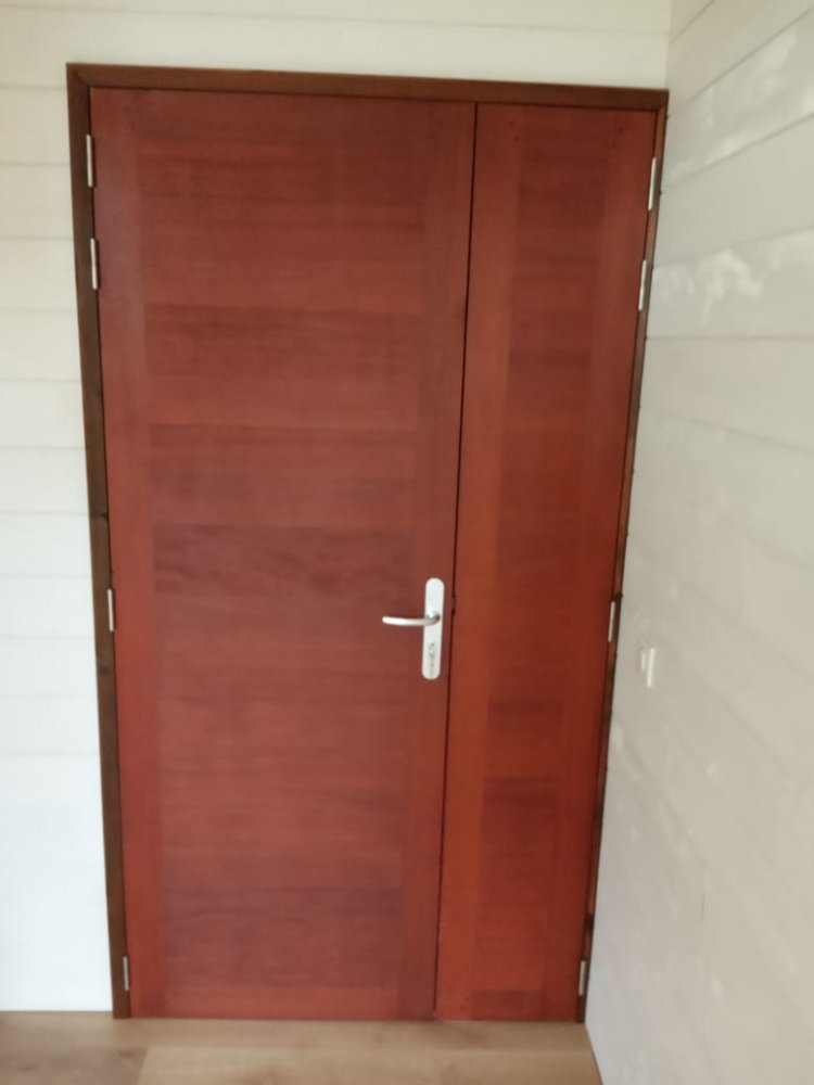 Conception et réalisation d’une porte sur mesure en bois exotique. Pose sur le chantier à Étang-Salé.