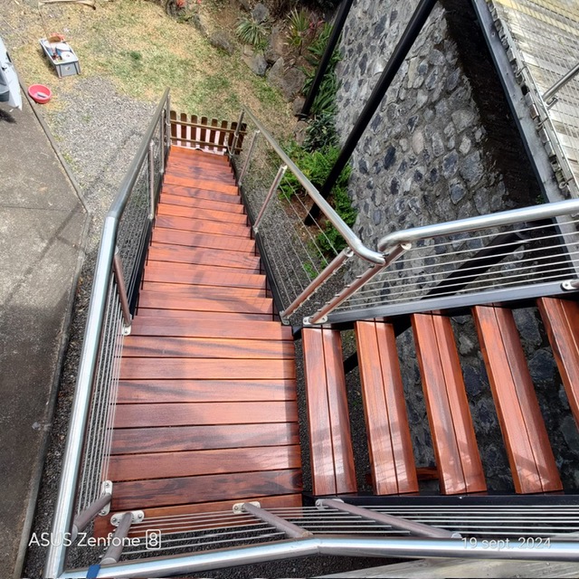 Offrez à votre escalier extérieur durabilité et élégance avec des marches en Muiracatiara, un bois exotique résistant aux intempéries. Reconnu pour sa robustesse et son esthétique unique, il garantit longévité et beauté naturelle. Nos experts assurent un remplacement professionnel et soigné pour un résultat durable et sécurisé.