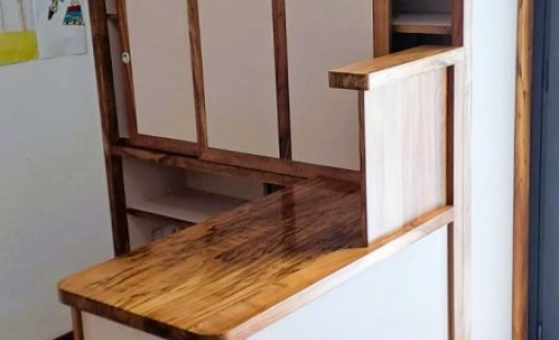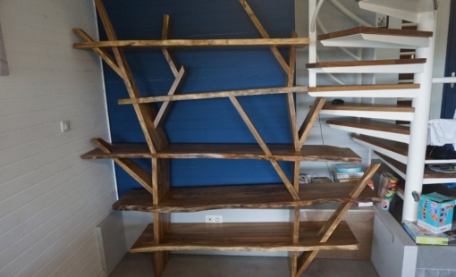 Conception et réalisation d’une Etagère sur mesure en bois de Tamarin. Pose sur le chantier sur Saint Paul de la Réunion.