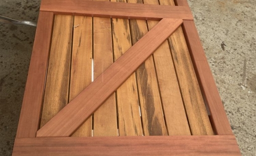 Réalisation d'une porte en bois exotique, en atelier par notre équipe de menuisier bois. Projet pour un local piscine sur Saint-Paul de La…